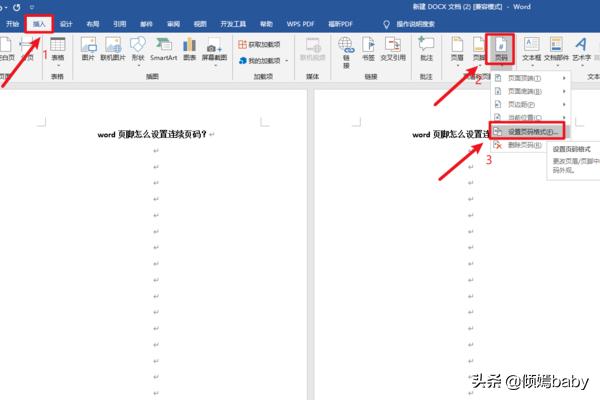 1.点击“插入”,点击“页码”,选择打开“设置页码格式”。