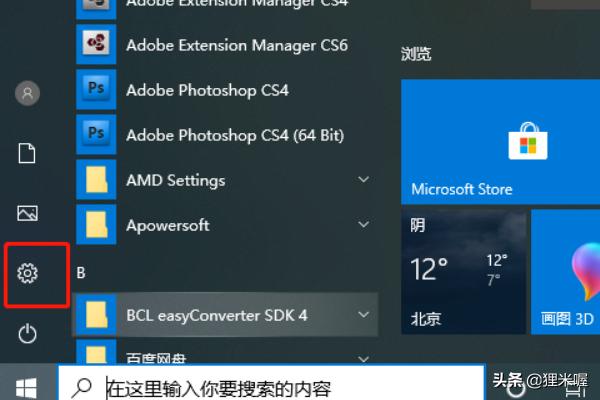 2、在弹出的开始菜单里,找到设置图标,点击进入。