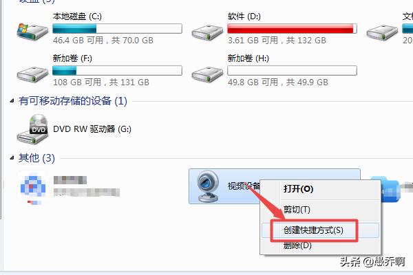 3、也可以根据需要创建快捷方式,鼠标右击视频设备,在出现的菜单中点击创建快捷方式选项,回到桌面中就可以看到摄像头的快捷方式了。