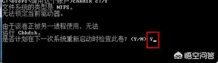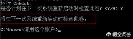 2丶当使用该卷并且您无法运行chkdsk时,请按照提示在光标处输入Y或N,以设置是否在下次启动时运行chkdsk进行磁盘自检。