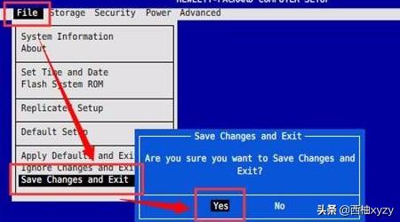 5、选择“File”下“Save Changes and Exit”选项按回车后选择“Yes”保存并退出BIOS,开机在HP Logo处按F12键即可进行网络引导。