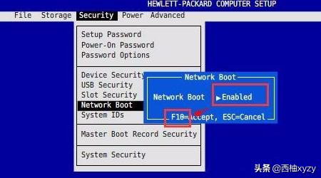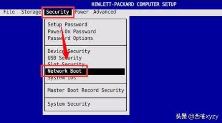 1、开机在HP Logo界面按F10键进入BIOS Setup界面。选择“Security”—“Network Boot”选项后按回车键。