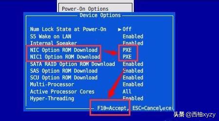 4、将“NIC Option ROM Download”及“NIC1 Option ROM Download”(仅双网卡工作站可见)选项状态更改为“PXE”后按F10保存。