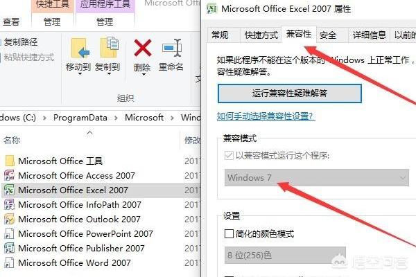 3、接着,在文件所在的位置窗口中右键单击Excel2007,点击属性,在属性的窗口勾选兼容标签栏目下的以兼容模式运行这个程序。