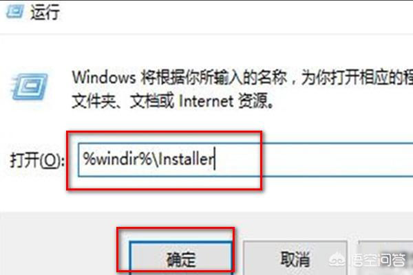 5、在电脑键盘上按快捷键WIN+R打开运行的对话窗口,输入%windir%\Installer,再点击确定按钮。
