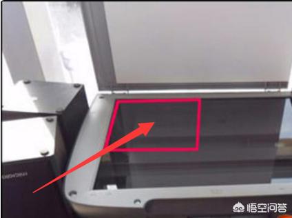 1、首先需要确认打印机是带有扫描功能的,将上盖掀开,把文件有内容的一面朝下放置下图中标注的位置附近。