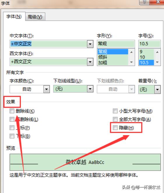 点击小箭头会弹出一个对话框,我们在对话框里找到效果设置,把效果设置里面的隐藏打上勾,最后点击下面的确定,这样也可以删除Word文档最后一页的空白页。