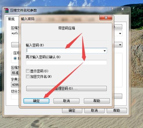 然后在设置密码窗口的输入框中输入密码,而且两次输入的密码要一样,否则会提示重新输入;输入好之后,点击确定,然后点击 ‘确定’,等一会,它就压缩完了。