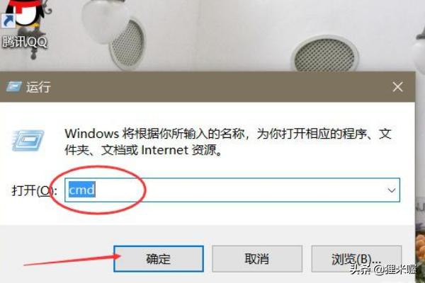 1、使用快捷键【win键+R键】打开运行窗口,在运行窗口中的输入域输入【cmd】并点击【确定】。