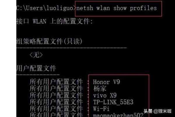 2、在弹出的黑窗口中输入“netsh wlan show profiles”(可复制粘贴)可以查看电脑连接过的WiFi名称。