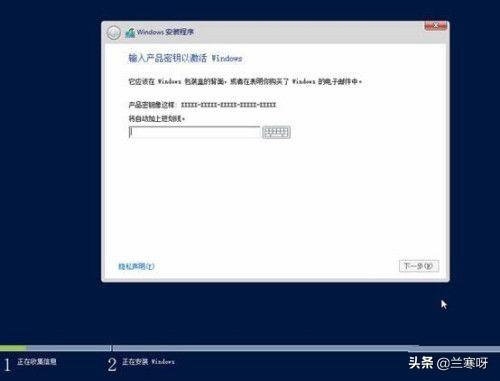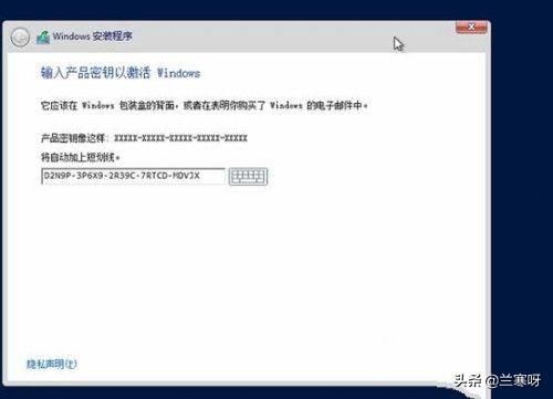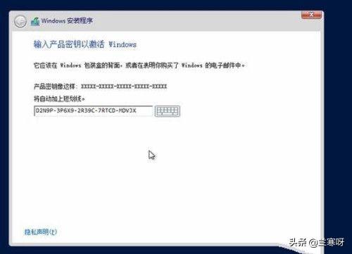 不用担心,网上安装密钥还是挺多的,大家可以用下面的D2N9P-3P6X9-2R39C-7RTCD-MDVJX ,有一点要提示,这是安装密钥,只是试用的,如果要长期使用需要购买正版密钥激活操作系统